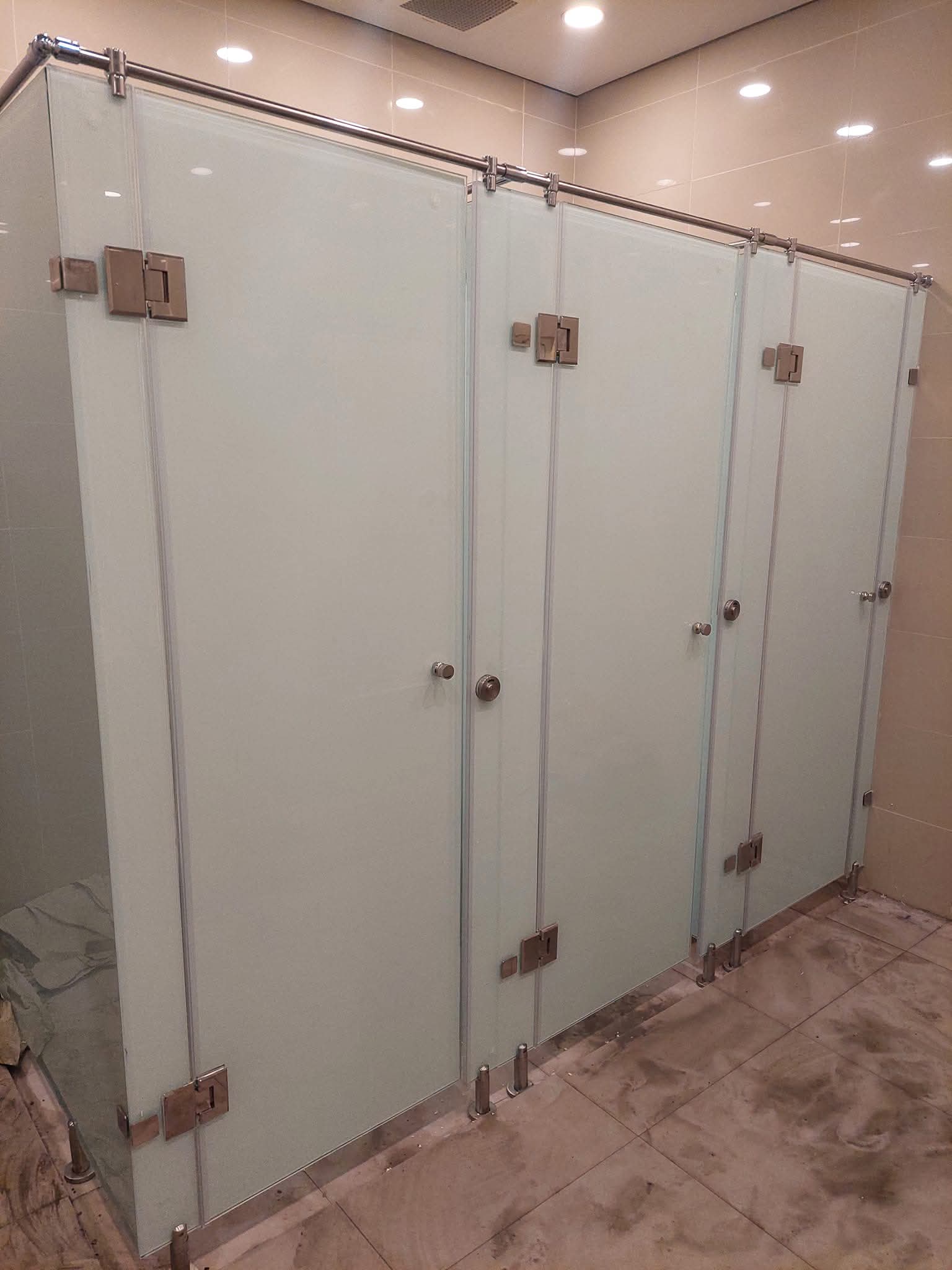 Pekerjaan instalasi kaca pada cubical toilet meliputi pemasangan panel kaca sebagai pembatas antar ruang toilet untuk menciptakan area yang privat, bersih, dan modern. Proses ini dilakukan dengan menggunakan kaca berkualitas tinggi yang tahan terhadap kelembapan dan mudah dibersihkan, serta rangka aluminium atau stainless steel untuk memastikan kekuatan dan keamanan. Instalasi dilakukan secara presisi agar hasil akhir rapi, kokoh, dan sesuai dengan desain interior, sehingga memberikan kenyamanan dan estetika pada fasilitas toilet.